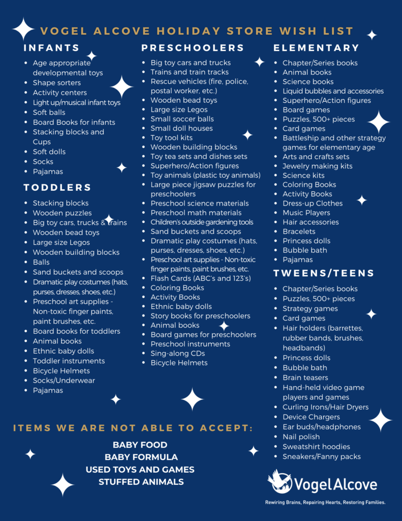 Each December, we open our ‘store’ that is stocked with items to make a child’s holiday extra special. Held on Thursday, December 9, through Saturday, December 11, parents can select from a broad array of toys, books, games and clothes that will light up their children’s eyes this holiday season.