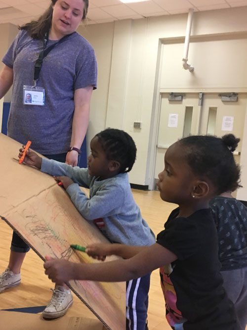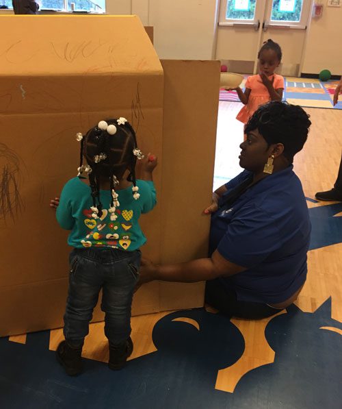 Work Together Wednesday focused on a service project for the school or community. In the Backyard, the theme of building together was carried through with big blocks, boxes and more!